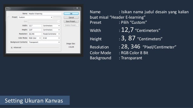 - Setting Ukuran Kanvas Name : Isikan nama judul desain yang kalian buat misal “Header E-learning” Preset : Pilih “Custom” Width : 12,7“Centimeters” Height : 3, 87 “Centimeters” Resolution : 28, 346 “Pixel/Centimeter” Color Mode : RGB Color 8 Bit Background : Transparant