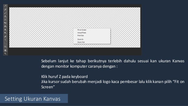 - Setting Ukuran Kanvas Sebelum lanjut ke tahap berikutnya terlebih dahulu sesuai kan ukuran Kanvas dengan monitor komputer caranya dengan : Klik huruf Z pada keyboard Jika kursor sudah berubah menjadi logo kaca pembesar lalu klik kanan pilih “Fit on Screen”