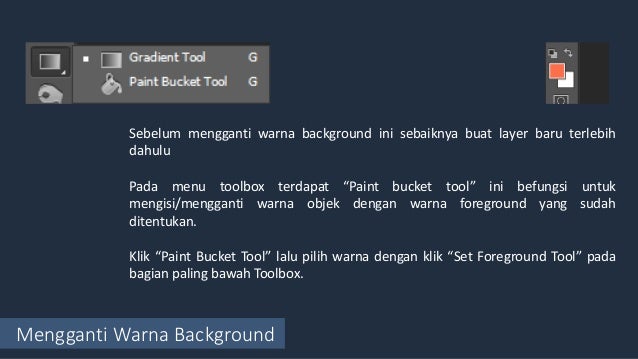 - Mengganti Warna Background Sebelum mengganti warna background ini sebaiknya buat layer baru terlebih dahulu Pada menu toolbox terdapat “Paint bucket tool” ini befungsi untuk mengisi/mengganti warna objek dengan warna foreground yang sudah ditentukan. Klik “Paint Bucket Tool” lalu pilih warna dengan klik “Set Foreground Tool” pada bagian paling bawah Toolbox.