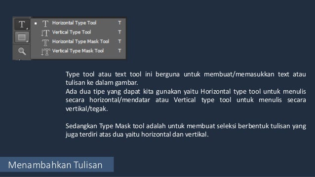- Menambahkan Tulisan Type tool atau text tool ini berguna untuk membuat/memasukkan text atau tulisan ke dalam gambar. Ada dua tipe yang dapat kita gunakan yaitu Horizontal type tool untuk menulis secara horizontal/mendatar atau Vertical type tool untuk menulis secara vertikal/tegak. Sedangkan Type Mask tool adalah untuk membuat seleksi berbentuk tulisan yang juga terdiri atas dua yaitu horizontal dan vertikal.