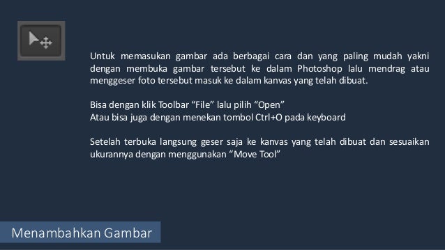 - Menambahkan Gambar Untuk memasukan gambar ada berbagai cara dan yang paling mudah yakni dengan membuka gambar tersebut ke dalam Photoshop lalu mendrag atau menggeser foto tersebut masuk ke dalam kanvas yang telah dibuat. Bisa dengan klik Toolbar “File” lalu pilih “Open” Atau bisa juga dengan menekan tombol Ctrl+O pada keyboard Setelah terbuka langsung geser saja ke kanvas yang telah dibuat dan sesuaikan ukurannya dengan menggunakan “Move Tool”