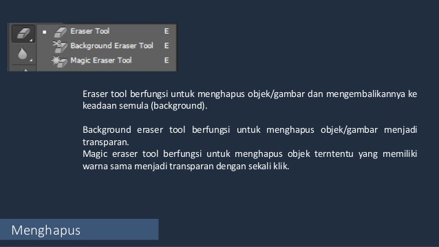 - Menghapus Eraser tool berfungsi untuk menghapus objek/gambar dan mengembalikannya ke keadaan semula (background). Background eraser tool berfungsi untuk menghapus objek/gambar menjadi transparan. Magic eraser tool berfungsi untuk menghapus objek terntentu yang memiliki warna sama menjadi transparan dengan sekali klik.